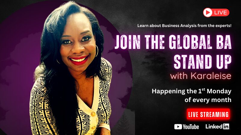 The Global BA Stand Up is a monthly live gathering hosted by Karaleise for business analysts around the world who want to sharpen their skills, stay current with industry trends, and grow with a like-minded community.